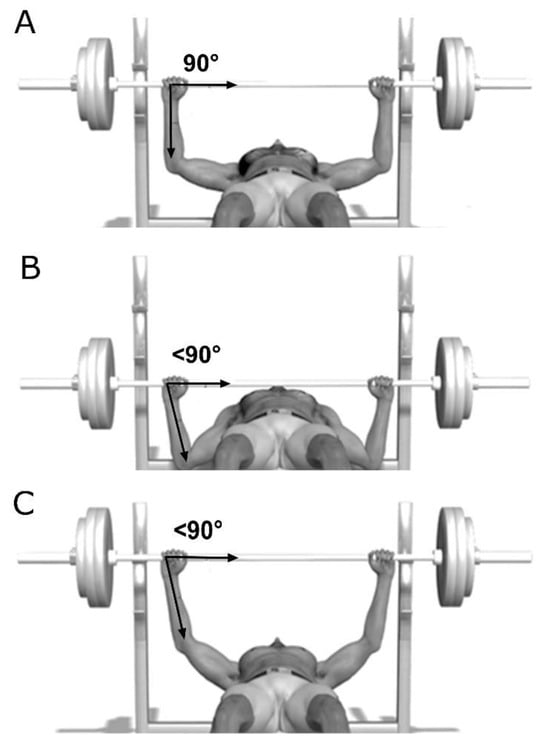 Bench press dynamic. Schematic representation of angles formed by the elbows and barbells during the performance of a traditional bench press exercise. The angle of the line hand–elbow and the barbell is reported. When the barbell is positioned on its support the angle is 90° (panel A). The start and end position are shown in panels B and C, respectively.