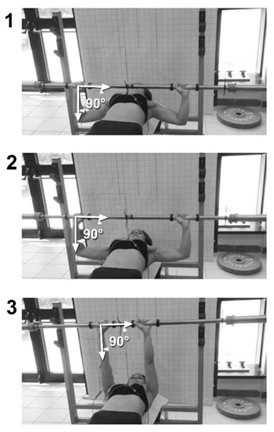 At the beginning of the exercise the subject is generally in a supine position on a bench under the barbell. The subject removes the barbell from the metal support gripping it with both hands so that the elbows form an angle of 90° with the bar, and the hands are in line with the elbows (Figure 1 panel A).