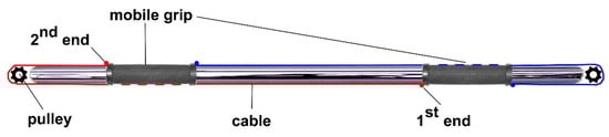 Two rectangular (4 × 3 mm2) deep channels were carved out of a 30 mm rod. The terminal part of the rod was then drilled 6 mm wide and 32 mm long for the depth of the entire rod diameter. At the end of the same rod, a 6 × 32 mm2 milling was carried out for the entire diameter of the rod. The first hole houses a steel cable of 2 mm, while the second receive the axis of a 29 mm diameter pulley on which the cable itself may rebound to reverse its direction from one burst to another. The grips, in addition to presenting a tooth able to slide in the guide preventing rotation, have, at their end, an ancho point for a cable which, once run through the rod by its length in the direction of one end, is wrapped around the pulley and then travels along the guide channel in the opposite direction, to pass under the same handle and end its run by fastening to the second handle.