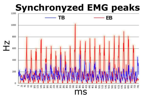 Electromyography (EMG) test performed both with the locked barbell (TB) (blue line), and the free grip-barbell (EB) (red line). Numeric EMG data was plotted on line-graphs by superimposing the two-to-two trials so that the test with the traditional barbell (blue line) and test with the experimental barbell (red line) would be on the same chart. A shift of the x axis data (time) was performed to synchronize the EMG peaks of the first test with the peaks of the second. An exemplificative result is reported.