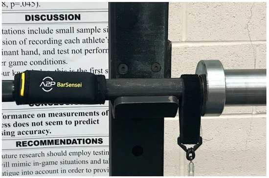 Between 3–7 days later, subjects reported back to the laboratory. Subjects were screened to ensure they had not performed strenuous lower body exercise within the prior 48 h. Sessions began with a 5 min warm up on the same cycle ergometer as previously used, again at 50–60 revolutions per minute (RPM) and 50 watts. Subjects then performed parallel back squats for two sets of three repetitions at 45%, 60%, and 75% of 1RM as determined at the initial testing session to represent the broad range of movement velocities that might be experienced in a typical resistance training program. Subjects rested for 2 min between each set. Prior to each set, subjects were reminded to control the eccentric phase and to perform the concentric phase with maximal velocity, and all repetitions were observed by an experienced strength and conditioning coach to monitor squat depth and technique. During this session, both the PowerTool and the Bar Sensei were attached to the barbell (20 kg Ohio Bar, Rogue Fitness, Columbus, OH, USA; Figure 1). For each repetition performed during this session, both MCV and PCV data were collected on each device. Subjects returned again to the lab after this testing session, 3–7 days later, to repeat this protocol.