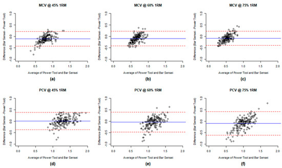 Bland–Altman plot of the measurements by Bar Sensei and PowerTool subject for MCV at 45% 1RM (a), 60% 1RM (b), 75% 1RM (c) and PCV at 45% 1RM (d), 60% 1RM (e), and 75% (f).