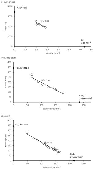 Thus, the present study confirmed previous findings [,,,,] that peak jumping power () is strongly correlated with cycling taken from either a flag-ground sprint test or a ramp start. Additionally, the present study showed for the first time that BMX riders with a high in their vertical jump-based Fv profile are most likely to have a high in their Tc profile and thus be able to produce high torque at the lowest cadences, such as at the onset of a ramp start. Incidentally, power in the first pedal stroke, at the lowest cadence, is one of the most decisive mechanical parameters for BMX starting performance []. This would suggest that high maximal strength at low movement velocities, as indicated by and , is rather important for BMX start performance. Although the from vertical jump-based Fv profiles did not line up consistently with , this parameter was shown to be less decisive for BMX starting performance than [].