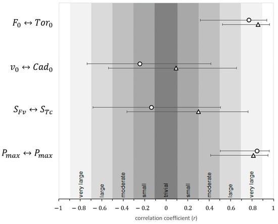 Correlation coefficients between force-velocity characteristics (, , , and ) from a vertical jumping test and torque–cadence characteristics (, , , and ) from BMX ramp starts (circles) and flat-ground sprints (triangles) on a BMX bike. Error bars represent 95% confidence intervals of the correlation coefficients.