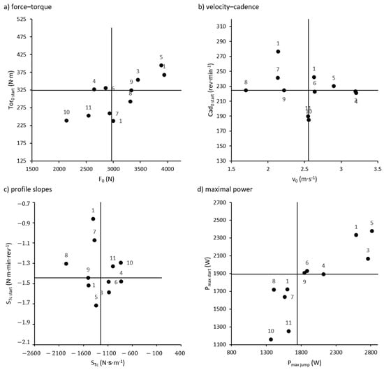 When participants were classified as lying above or below the group median for each of the Fv and Tc parameters from the ramp starts (Figure 3), 4 out of 11 riders had divergent classifications for and , although 3 of these lay within 1% of the median for one of the parameters. When comparing with , no riders had divergent classifications. On the other hand, 7 out of 11 riders had divergent classifications for and , as did 6 riders for and . When classifications were based on Tc characteristics from flat-ground sprinting instead of ramp starts, 2 out of 11 riders had divergent classifications for each of versus and versus . For each of versus and versus , 4 out of 11 riders had divergent classifications.