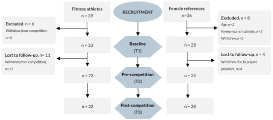Considering the growing popularity of fitness physique sports, and the fact that these athletes serve as the new, healthy body ideal for young women [31,35,36], we find it important to increase the knowledge on mental health symptoms in females who comply with such a lifestyle and at the same time participate in competitive fitness sports. As such, the aim of this paper was to explore the status of mental health symptoms (i.e., body image, eating behaviour, relation to and routines for exercise, and perfectionism) in young, female fitness athletes (FA), and to study how body image idealisation and eating and exercise behaviours correlate. Further, we aimed to study how a competitive period, which includes considerable energy restriction, may affect their body image, eating behaviour, relation to and routines for exercise, and level of perfectionism. In order to evaluate whether the findings are representative for the modern, young, physically active female or specific to this aesthetic sport, a reference group of recreationally active females (female references, FR) was included. We hypothesised the following: (1) the specific mental health symptoms are comparable between FA and FR at baseline; (2) during the dieting period for the FA (3–4 months), differences arise between FA and FR in mental health symptoms, with a deterioration in FA only; (3) shortly after the dieting period (i.e., one month post-competition), FA are still different from FR on outcomes related to body image and eating behaviour, but not in level of perfectionism or relation to and routines for exercise; and (4) high levels of body image idealisation correlate positively to destructive exercise routines (i.e., exercise dependence) and DE behaviour.