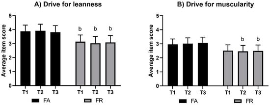 Scores in drive for leanness (A) and drive for muscularity (B). Values are average item scores (99% CI). Note: FA, fitness athletes; FR, female references; T1, baseline; T2, pre-competition; T3, post-competition; b, significant between-group difference, p < 0.01.