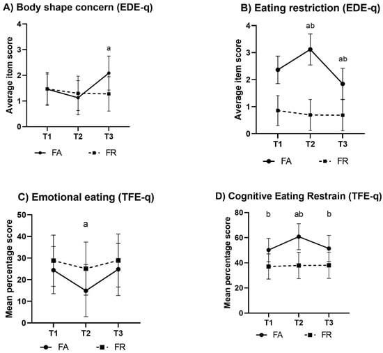 The results on eating restrictions are presented in Figure 3. Compared to T1, eating restriction was increased in FA at T2 (g = 0.8, p < 0.001), decreased at T3 (g = 1.1, p < 0.008), and different to FR at all times (g = 1.2, 2.3, 1.0 at T1–T3, respectively; p < 0.001).