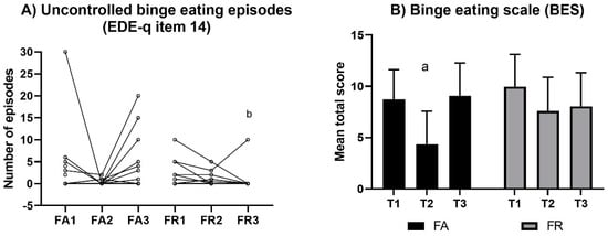 Individual variations in the reported number of uncontrolled binge eating episodes (A) and in mean symptoms of binge eating (B) within each group at each time point of evaluation. Values of Binge Eating Scale (BES) are the mean total score (99% CI). Note: FA, fitness athletes; FR, female references; T1, baseline; T2, pre-competition; T3, post-competition; FA1, baseline in FA; FA2, pre-competition in FA; FA3, post-competition in FA; FR1; baseline in FR; FR2, pre-competition in FR; FR3, post-competition in FR; a, significant within-group change (p < 0.001); b, significant between-group difference, p = 0.01.