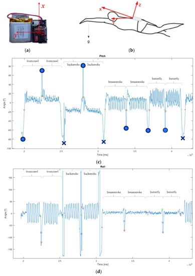 SwimBIT system overview. (a) Developed inertial measurement unit (IMU) with data logger and battery. (b) Body reference frame for a swimmer (adapted from []), where , , and are the forward, side-to-side, and vertical motions of the swimmer, respectively. (c,d) Examples of acquired data, representing the swimmer’s body pitch and roll, respectively (crosses represent the detected stops, circles represent the detected turns).