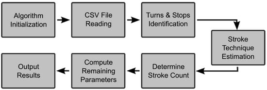 Data processing algorithms were developed to analyze the swimmer’s performance following the workflow represented in Figure 2. The initialization block retrieves parameters such as the length of the pool and metadata about the swimmer, among others. Afterward, the CSV file containing the acquired data was loaded, and the desired performance indicators were computed.