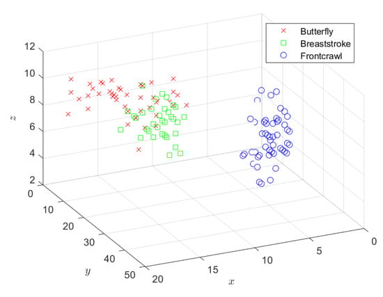 The front crawl, breaststroke, and butterfly laps of the dataset are represented in Figure 3. It can be seen that the dataset is not linearly separable, notably in terms of the butterfly and breaststroke styles.