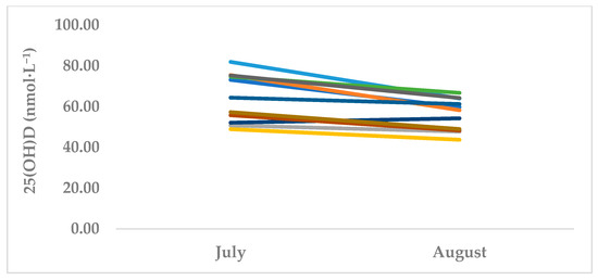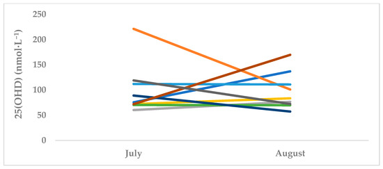 Serum 25(OH)D changes in MBB (n = 11). *Each line represents an individual MBB athlete. July is T1 (summer off-season) and October is T2 (autumn pre-season).