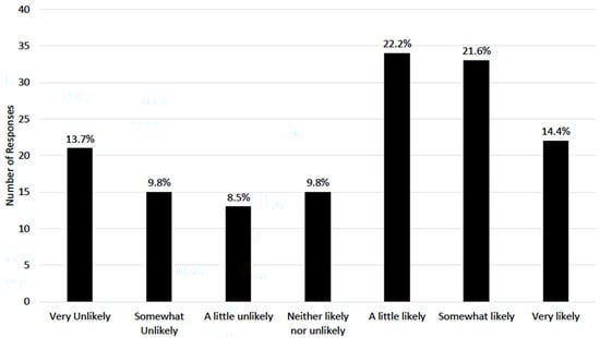 Only 28.4% of the parents were “very” or “extremely” concerned about the risk of injury in youth sports. Most parents believed that specialization increased their child’s chances either “quite a bit” or “a great deal” for getting better at baseball (N = 121, 79.6%) and making a college team (N = 107, 70.0%). Fewer than half of all parents believed that specialization would increase the chances of their child getting injured either “quite a bit” or “a great deal” (N = 72, 47.1%). The parents underestimated the number of college baseball scholarships available per team (median estimate [IQR]: 5 [0–5], compared to actual value of 11.7 scholarships per team). However, 55 parents (36.0%) believed it was “somewhat” or “very likely” their child would receive a college baseball scholarship (Figure 1).