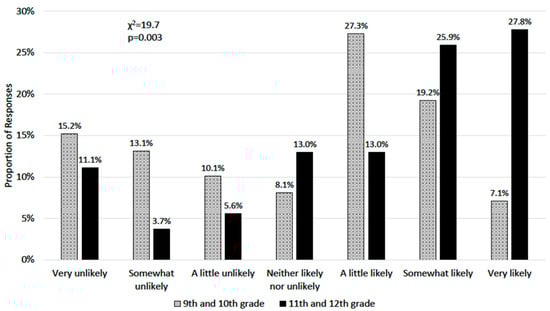 The parents of upperclassmen (11th or 12th grade) were more likely to believe it was somewhat or very likely (53.7%) that their child would receive a college baseball scholarship compared to underclassmen (9th or 10th grade) parents (26.3%, p = 0.003) (Figure 2).