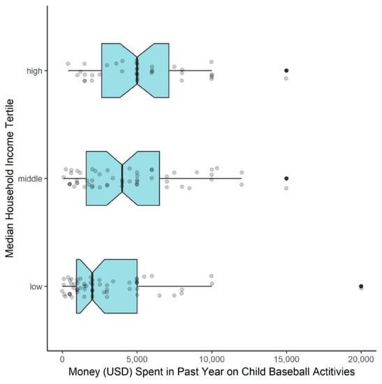 Comparison of money spent in past year on child’s baseball activities between parent MHI tertiles. Presented as a notched box plot, with box representing interquartile range (IQR), whiskers representing range of 1.5 times the IQR, line indicating median, notch displaying 95% confidence interval of the median, and individual data points for each parent (outliers in black).