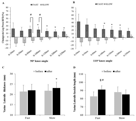 Percent changes in leg press rate of force development at knee angle (A) 90° and (B) 110° (* significant after training, # significant between groups), vastus lateralis (C) muscle thickness and (D) fascicle length changes (* p < 0.05; § p < 0.01 before and after training, # p < 0.05 between groups), after 6 weeks of fast or slow squat eccentric-only training.
