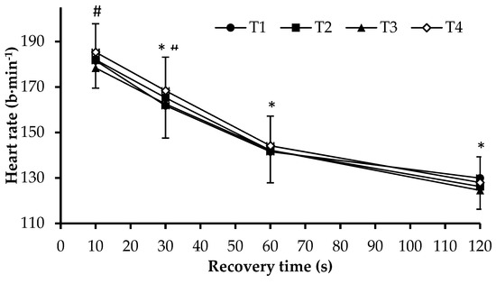 Figure 3. Heart rate changes during recovery after 400-m front crawl in testing moments T1 (beginning of the general preparation period), T2, T3, and T4 (end of four weeks of general preparation period, four weeks of specific preparation period, and three weeks of the competitive period). *: p < 0.05 compared to previous and next time point. #: p < 0.05 between T3 and T4. (Mean ± SD, n = 43).