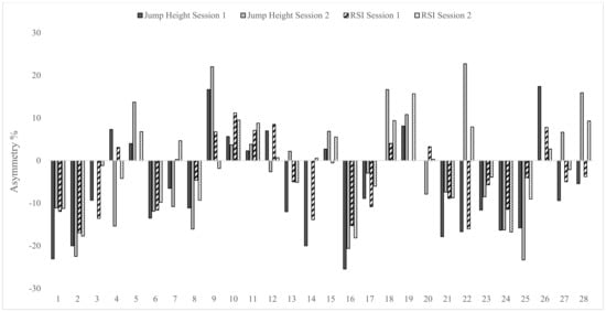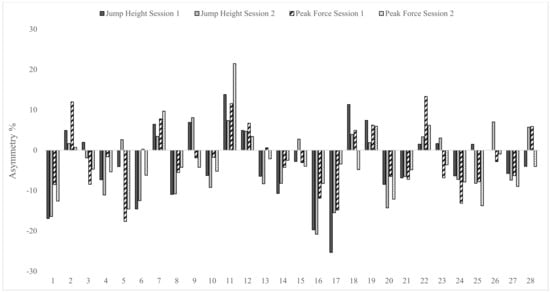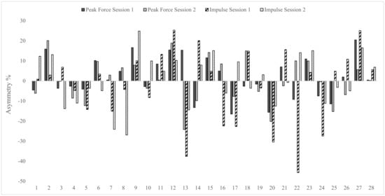 Data in Table 4 displays the Kappa coefficients and accompanying descriptors for how consistently asymmetry favoured the same leg between test sessions, for each metric. The Kappa coefficient describes the proportion of agreement between two methods after any agreement by chance has been removed []. Levels of agreement were fair to substantial (0.29–0.64) for the isometric squat, substantial (0.64–0.66) for the CMJ and fair to moderate (0.36–0.56) for the DJ. Furthermore, it is interesting to note that greater levels of agreement appear to be associated with improved test reliability, noting that the CMJ showed the lowest CV values both within and between test sessions. These data indicate that the direction of asymmetry (i.e., how consistently the same leg scores higher between test sessions) varies considerably. Given this variable nature, it is suggested that individual data analysis is a key consideration for practitioners when monitoring inter-limb asymmetry (see Figure 2, Figure 3 and Figure 4). Despite recent literature highlighting poor levels of agreement for the same metric across tests [], to the authors’ knowledge, this is the first study to report levels of agreement for the direction of asymmetry over more than a single test session. Thus, direct comparisons with previous research are not possible and requires further investigation using longitudinal study designs.