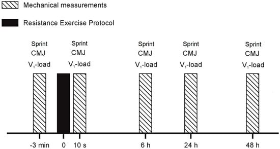 In order to compare the mechanical response, as well as the time course of recovery following each protocol analyzed, participants underwent a battery of measurements at different time points: pre-exercise (Pre), post-exercise (Post), 6 h-Post, 24 h-Post, and 48 h-Post. Movement velocity against the load that elicited a 1 m·s−1 mean propulsive velocity at baseline measurements (V1-load), vertical countermovement jump (CMJ) height, and running sprint time in 20 m (T20) were assessed at Pre, Post, 6 h-Post, 24 h-Post, and 48 h-Post (Figure 1). These mechanical measurements have been described in detail elsewhere []. The V1-load was chosen because it represents a sufficiently moderate loading intensity (~60% 1RM in SQ) [] to allow ready detection of the effect of fatigue on movement velocity and quick to establish as part of the warm-up [].