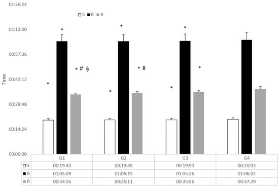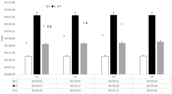 Figure 2) showed significant differences in swim only between G4 and the other groups (p range from 0.001–0.039), while for the running segment each group differed significantly from the others (