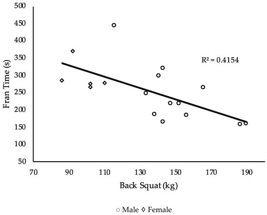 Though total body strength was not a significant predictor of overall CrossFit® benchmark performance, back squat strength was a significant indicator for the workout Fran. Fran requires participants to complete forty-five front squats, requiring both muscular strength and endurance as well as the ability to perform under fatigued conditions. Muscular strength and endurance have previously demonstrated significant relationships to one another [,]. Greater lower body strength has also demonstrated a significant relationship to performance under fatigued conditions in rugby players (r = 0.72, p = 0.013) []. Lower body strength, specifically squat strength, may influence other fast paced CrossFit® workouts that require a squatting movement.