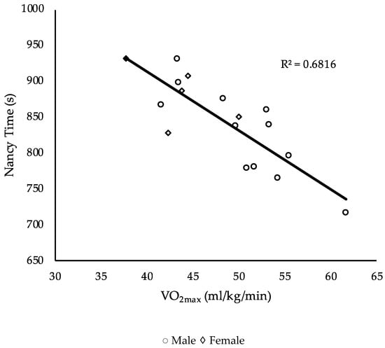 Previous literature recommended future research examine the workout Nancy, as data from this workout may better reflect physiological data collected during a running VO2max test as were implemented within this study []. Given that CS is a maximal sustainable pace, and due to its strong relationship to VO2max, it was hypothesized to be a significant indicator of overall CrossFit® benchmark performance [,]. Both CS and VO2max were significantly correlated to Nancy performance, and both variables have been used to predict running performance [,]. However, VO2max was the greatest predictor of performance on this workout, explaining 68% of the variance. This may indicate that those with a higher VO2max may perform better on longer workouts that require running.