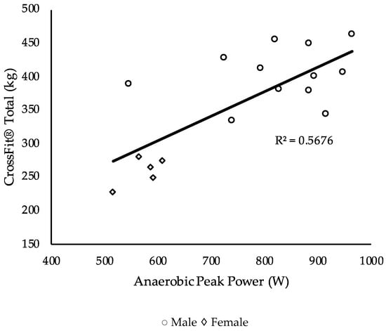 Though the CrossFit® total was used as a performance measure, it is also considered a benchmark workout, which is why it was included in the analysis []. Anaerobic peak power explained 57% of the variance and was the only statistically significant measure, F (1, 15) = 19.7, p < 0.001.