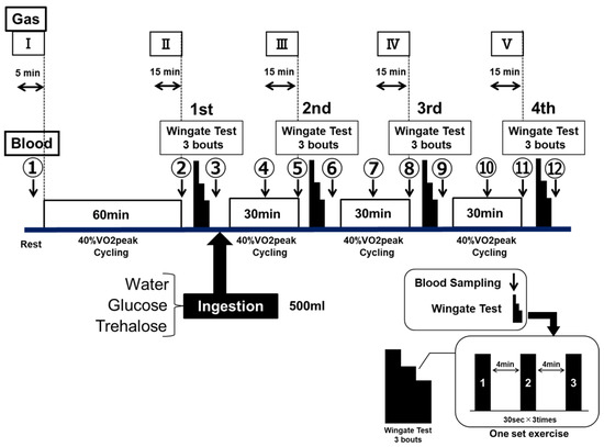 The exercise performance was assessed by using ultra-high-intensity intermittent exercise (the Wingate test). The Wingate test was performed by using an electromagnetic brake-type bicycle ergometer (PowerMax VIII; Combi Wellness, Tokyo, Japan), the pedals of which were given a load of 0.075 kg/kg body weight [27]. Each set of exercise consisted of three bouts of 30-s full-power cycling, with a 4-min recovery between each bout (see Figure 1—Wingate test).