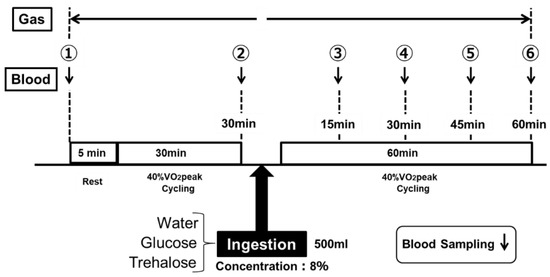 The representative method for increasing glycogen stores is called “glycogen loading”. In this method, muscle glycogen re-synthesis is enhanced by depleting the muscle glycogen stores by heavy physical activity, and then eating a diet rich in carbohydrates (exhaustive depletion followed by a carbohydrate-rich diet) [10]. Other methods include the ingestion of carbohydrate drinks, such as sports drinks for nutritional support before or during exercise. Many preceding studies have investigated the relationship between the effect of carbohydrate ingestion in improving performance and the types of carbohydrates ingested during exercise, as well as their ingestion method [11,12,13,14,15,16,17]. However, because absorption properties and availability in skeletal muscles differ depending on the types of carbohydrates ingested before or during exercise [18,19], foundational data regarding nutrient dosing and timing, which may enhance exercise performance, has yet to be established for trehalose (TRE).