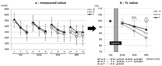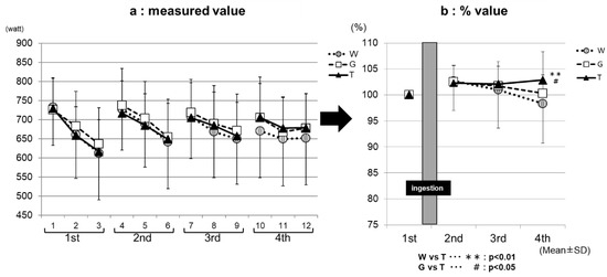 Figure 4. The maximum power assessments. * W—water; G—glucose; T—trehalose. Comparison of the maximum power value among the exercises (1–4 sets) for each trial (WAT, GLU, or TRE). (a) The measured value. (b) For each trial, the values for the Wingate-test performance in the second to fourth set were compared with and expressed as percentages of that in the first set.