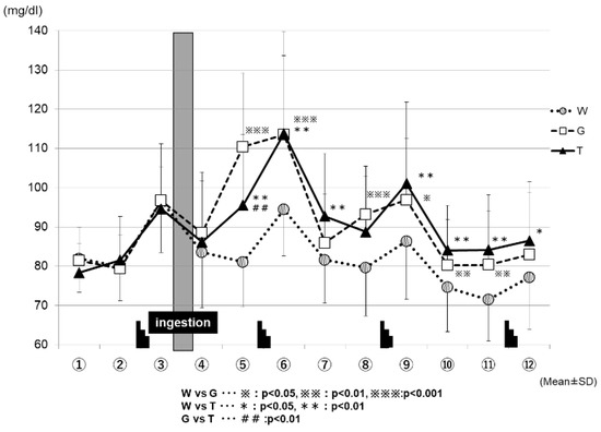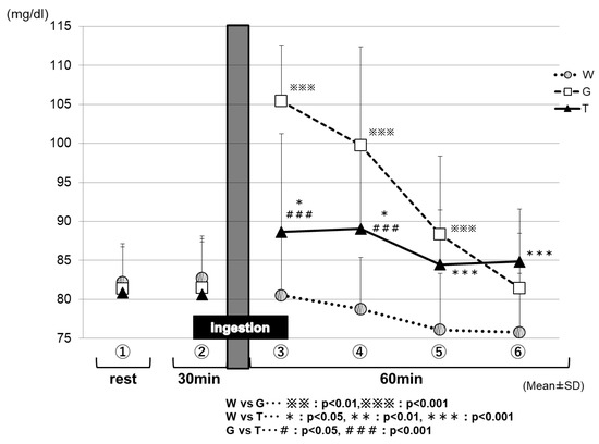 Figure 8. Comparison of the blood glucose levels for each trial. After the ingestion of the test drink, each trial exhibited changes in the blood glucose levels, reflecting the properties of its test drink. * W—water; G—glucose; T—trehalose.