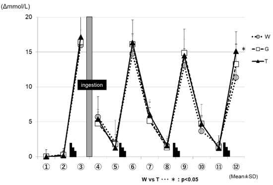 Figure 5. Changes in the blood glucose levels for each trial. * W, water; G, Glucose; T, Trehalose.
