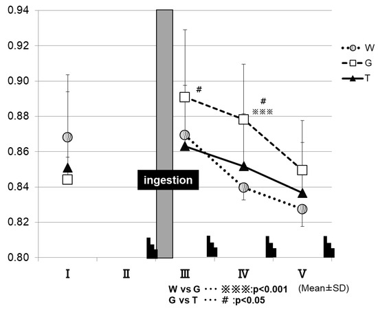 Figure 7 shows the changes in RER for each trial. After the ingestion of the test drink, the trial GLU exhibits higher RER levels until the final phase of the examination, in contrast to the other two trials. At 15 min after test-drink ingestion (III in Figure 7), the RER was significantly higher in the GLU trial (0.89 ± 0.04) than in the TRE trial (0.86 ± 0.03) (GLU vs. TRE, p < 0.05). At the time-point of IV in Figure 7, the RER was significantly higher in the GLU trial (0.88 ± 0.03) than in the trials of TRE (0.85 ± 0.03) and WAT (0.83 ± 0.03) (WAT vs. GLU, p < 0.001; GLU vs. TRE, p < 0.05).