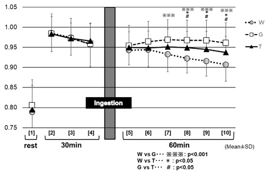 Figure 9 shows the changes in the RER for each trial. Between 30 and 60 min (at the end of the trial) after the test-drink ingestion (⑦ to ⑩ in Figure 9), the RER remained significantly higher in the GLU trial (0.97 ± 0.04 to 0.96 ± 0.04) than in the trials of TRE (0.95 ± 0.05 to 0.94 ± 0.04) and WAT (0.93 ± 0.04 to 0.91 ± 0.04) (⑦: GLU vs. TRE, p < 0.05; WAT vs. GLU, p < 0.001 to ⑩; GLU vs. TRE, p < 0.01; WAT vs. GLU, p < 0.001). Between 40 and 60 min (at the end of the trial) after the test-drink ingestion (⑧ to ⑩ in Figure 9), the RER decreased slightly in the TRE trial, to the later stages of exercise (0.95 ± 0.05 to 0.94 ± 0.04), whereas, it decreased markedly in the WAT trial (0.92 ± 0.04 to 0.91 ± 0.04). The RER was significantly higher in the TRE trial than in the WAT trial (⑧: TRE vs. WAT, p < 0.01, to ⑩: TRE vs. WAT, p < 0.01). After 40 min of the test-drink ingestion, the three trials exhibited significantly different RER values from each other.