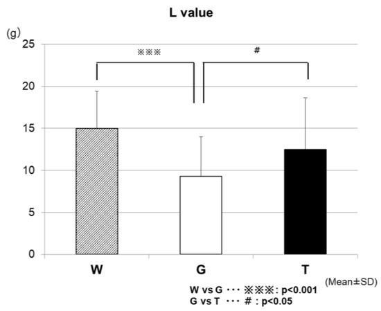 Figure 10. Comparison of the total lipid oxidation (L-value) during the 60-min exercise among the three trials. * W—water; G—glucose; T—trehalose.
