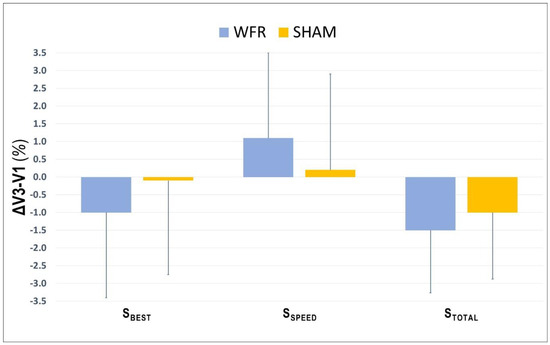 The average values for SBEST and STOTAL were improved at V3 compared with V1, in both SHAM (SBEST: V1, 3.065 ± 0.128 s; V3, 3.058 ± 0.091 s; STOTAL: V1, 39.687 ± 1.336 s; V3, 39.280 ± 1.663 s) and WFR (SBEST: V1, 3.049 ± 0.080 s; V3, 3.018 ± 0.106 s; STOTAL: V1, 39.785 ± 1.649 s; V3, 39.182 ± 1.752 s). However, no clear difference was observed between groups for SBEST (ΔV3−V1: SHAM −0.1 ± 2.7% vs. WFR −1.0 ± 2.4%; ES −0.25 ± 0.72; 14/31/57%), SSPD (ΔV3−V1: SHAM 0.2 ± 2.7% vs. WFR 1.1 ± 2.4%; ES 0.25 ± 0.72, 55/31/14%), and STOTAL (ΔV3−V1: SHAM −1.0 ± 1.9% vs. WFR −1.5 ± 1.8%; ES −0.12 ± 0.45; 11/51/38%) (Figure 1). When times were pooled by sprint clusters, the differences between conditions were still unclear, despite a tendency for improvements with WFR in three of the four clusters (Figure 2). Notably, the WFR-SHAM difference was the greatest in cluster S10−S12 (ΔV3−V1: SHAM −1.3 ± 2.6% vs. WFR −2.7 ± 2.8%; ES −0.25 ± 0.46; 6/37/57%). Finally, data indicated that WFR had no clear impact on %SDEC (ΔV3−V1: SHAM −0.9 ± 4.0% vs. WFR −0.5 ± 2.2%; ES 0.39 ± 1.74; 58/15/27%).