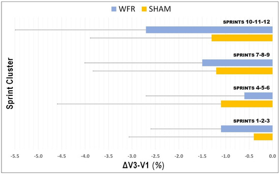 Changes in times pooled by sprint clusters from V1 to V3 under SHAM and WFR conditions. Note: Data are expressed in percentage changes from V1 and presented as means ± SD.
