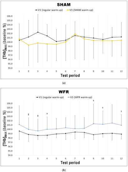 Changes in [THb]MAX from V1 to V3 during each period of the RSA test under (a) SHAM and (b) WFR conditions. Note: Data are expressed as percentage of the resting baseline values and presented as means ± SD. WFR compared to SHAM: †, likely large effect; ‡, very likely large effect.