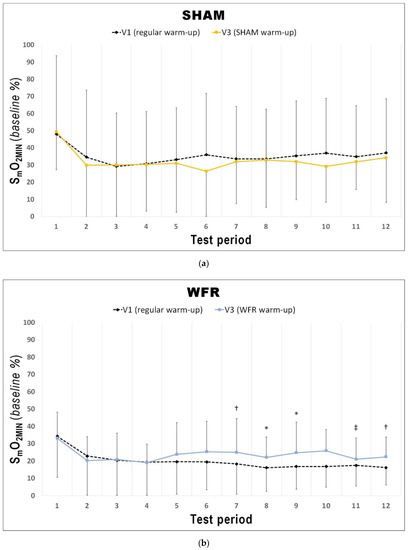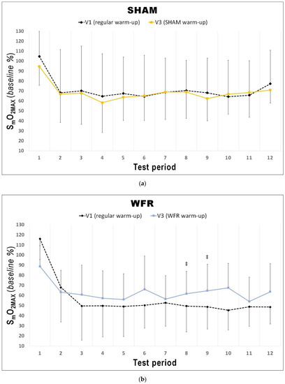Changes from V1 to V3 in SmO2MAX during each period of the RSA test under (a) SHAM and (b) WFR conditions. Note: Data are expressed as percentage of the resting baseline values and presented as means ± SD. WFR compared to SHAM: ‡, likely moderate effect.