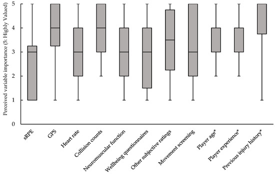 Box and whisker plot showing the median, interquartile range and range of values associated with responses to the question: “On a scale of 1–5, how highly do you value the following measures for the management of individual injury risk (where 5 represents highly valued and 1 represents not at all valued).” Grey boxes indicate the median and interquartile range, whereas the upper and lower end of the whiskers represent the lowest and highest observations, respectively. Variables exhibiting an asterisk presented the same median and upper quartile values, therefore the median is not visible. sRPE, session Rating of Perceived Exertion; GPS, Global Positioning System.
