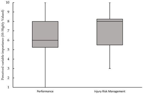 A second question was asked of the participants, which aimed to further understand the importance of GPS measures in the management of not only injury risk but also individual player performance. The results of this question are shown in Figure 2 and demonstrate the overall relative importance of GPS metrics for managing individual injury risk compared with the assessment in performance (median of 8 vs. 6). Furthermore, there was a wider spread of values associated with the use of GPS as a performance assessment tool (range: 1–10 vs. 3–10 for injury risk management) with one participant deeming it not at all useful.