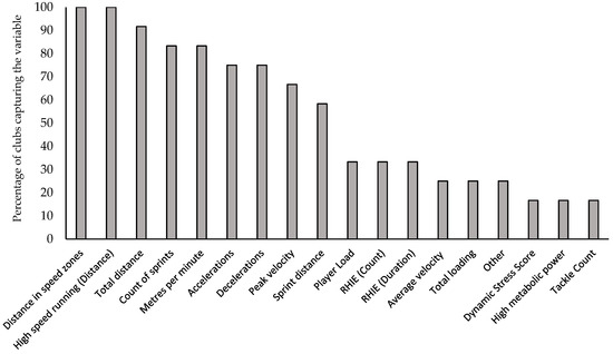 (x-axis) GPS metrics captured and (y-axis) percentage of teams recording these metrics. RHIE, Repeated high intensity efforts.