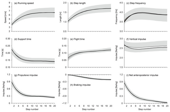 Mean and standard deviation of the approximated (a) running speed, (b) step length, (c) step frequency, (d) support time, (e) flight time, (f) vertical impulse, (g) propulsive impulse, (h) braking impulse, and (i) net anteroposterior impulse for 20 steps. Mean values are plotted at each step. Dotted and solid lines represent the pre- and post-trials, respectively. The grey shaded area represents standard deviation for each of the pre- and post-trials.