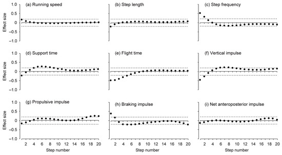 Effect sizes between the pre- and post-trials at each step for (a) running speed, (b) step length, (c) step frequency, (d) support time, (e) flight time, (f) vertical impulse, (g) propulsive impulse, (h) braking impulse, and (i) net anteroposterior impulse. Horizontal dotted lines indicate the smallest worthwhile change (0.2).