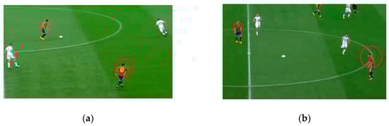 (a) Player (red circle) performs a scan by turning his head and looking away from the player in ball possession. (b) Player (red circle) performs a transition scan by turning his head and looking away from the player and the ball while the ball is in transition.