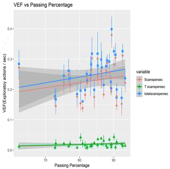 The first result of the present study was that the scanning rate of a player was positively correlated with his pass completion rate. Although a considerable amount of exceptions exists, a higher pass completion showed tendencies of higher levels of success in the 2014 FIFA world cup []. It has been shown in multiple studies that a high pass completion rate in individuals and in teams indicates higher individual and team performance [,]. Passing statistics, especially completion rate, may be a key indicator of individual player performance according to the results in the current study. VEF might play a role in reaching high pass completion rates. The present study shows a significant positive correlation between the VEF (total scans and scans) and pass completion rates of midfielders and may be an indicator that average VEF may contribute to individual passing performance in a real game situation, although the values shown in correlations were very low (3%–4%). Such differences may still play an important role in determining the ability of an elite player. As in the case of elite youth players, these small differences may result in larger differences over time with deliberate training [].