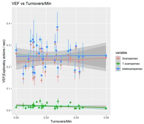 Results below in Figure 3 and Table 2 show a significant negative correlation between turnovers per minute and “transition scans” (p = 0.023, = 3.51%). The scans and total scans show no significant correlations.
