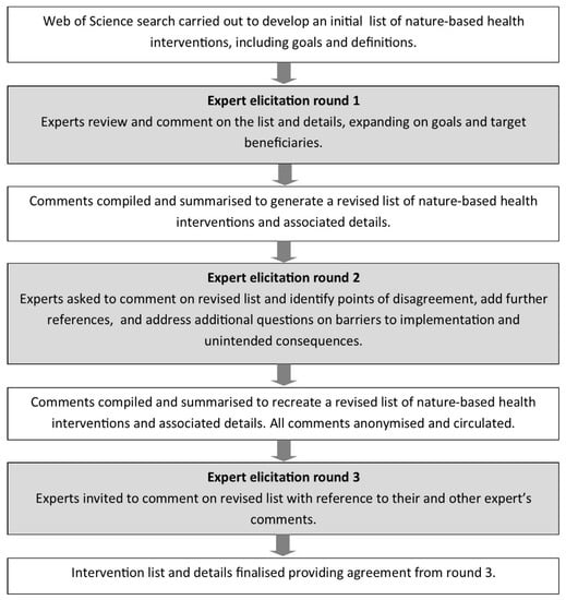 We used a Delphi expert elicitation process [33] to develop and then to refine and improve a list of NBIs that have received attention in the peer–reviewed scientific literature to date (Figure 1). The Delphi technique is an iterative method for building consensus. In this case, it was based on three rounds of questionnaires. Before the rounds of questions began, D.F.S. carried out a broad–reaching Web of Science literature search (initial search terms including ‘nature AND health OR wellbeing’, ‘nature–based health interventions’, ‘nature interventions’). The goal of this search was not a comprehensive review, but to develop a list of interventions—that is, programmes, activities or strategies that aim to engage people in nature experiences with the specific intention of improving health and wellbeing outcomes. The articles identified through the initial search were assessed, and NBIs identified where possible; further articles were found through the reference lists within the initial article set.