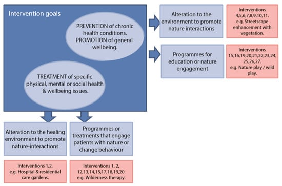 The intended outcomes and target beneficiaries varied widely across interventions, from the promotion of wellbeing and the prevention of chronic or lifestyle–based health conditions (e.g., through the provision of public parks) to targeted treatments for people living with specific health conditions (e.g., nature prescriptions for reducing high blood pressure). A categorisation of the different interventions is given in Figure 2; some aim to change the environment in which people live (e.g., providing new or better quality public green spaces [18,28,34]; Table 1) and work (e.g., hospital, workplace), and others aim to change people’s behaviour and their interactions with nature (e.g., nature play/wild play programmes [35]; Table 2 and Figure 2). There was some overlap in these categories where people engaged in nature–based activities through interventions that also involved enhancing the environment (e.g., ‘green gyms’ or environmental volunteering; Table 2).